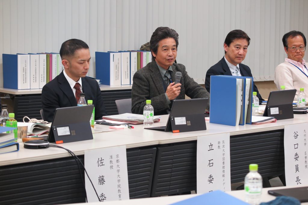 午後の部は、令和8年度に実施される国立大学法人の4年目終了時評価(注)を見据えたものでした。令和4年度から令和7年度までの実績(見込みを含む)及び令和8年度から令和9年度への展開について、菅理事より、入学者選抜、学士課程教育、大学院教育、教学マネジメントの順で各計画4年間の進捗状況説明があった後、計画ごとに十分な時間をかけて質疑を行いました。午後の締めくくりは、外部評価委員6人から所感が述べられました。谷口委員長からは、「これまで構築してきたものを礎石として、いかに継承し、次の発展方策に繋いでいくのかが重要である」とのコメントをいただきました。最後に、菅理事が、外部評価委員に感謝の意を述べ閉会しました。